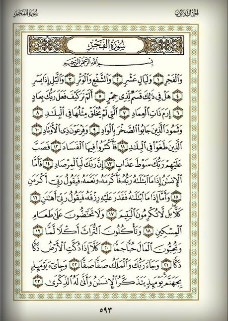 در آیه اول، خداوند، به فجر قسم خورده است. به این انفجار نور در خیمه ظلمتشب. جالب است که بدانیم سوره «فجر» بعد از سوره «لیل» نازل شده است همچنانکه در طبیعت هم سپیده دم فجر، پس از «شب»، فرا مىرسد.